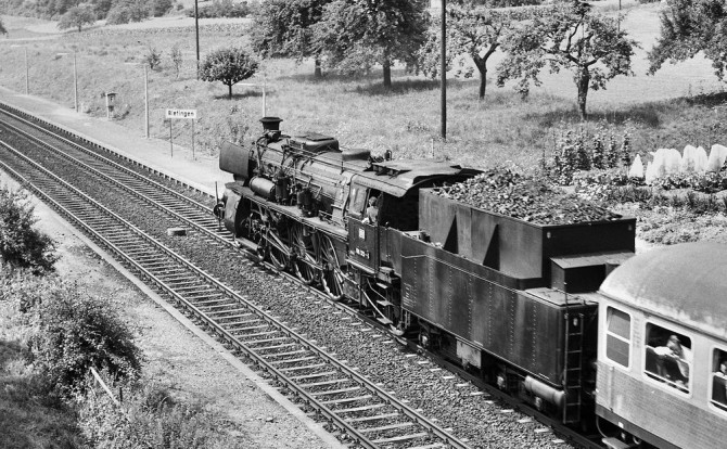 Bild oben: Die allerletzte Fahrt führte die 18 323 im September 1969 von Frankfurt nach Basel. Hier steht die Lok in BW Frankfurt Main. Copyright: Günter Hauthal / Slg. Eisenbahnstiftung