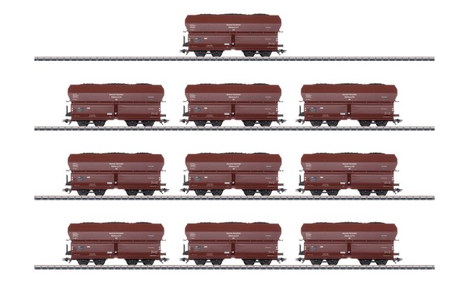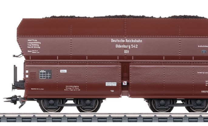 Passend zur neuen E 95 erscheint das Modell des OOt (z) 23 Oldenburg. Dieser Selbstentladewagen wurde von der DRG quasi zeitgleich mit den Lokomotiven der Baureihe E 95 beschafft. Insgesamt wurden zwischen 1928 und 1932 knapp 350 Wagen aus mehreren Bauserien unterschiedlicher Hersteller beschafft. Das mit Kohle beladenen Modell entspricht der ersten Bauserie von Orenstein & Koppel der Nummern 501 bis 590 mit Lenkachsen und Zweiwellenverschlüssen. Die Wagen besitzen im Unterschied zu den bisher erschienenen Wagen der Bauart OOt (z) 41 / 43 einen genieteten Wagenkasten ohne Einpolterungen zum Aufstieg und ein anderes Untergestell. Exklusiv für Märklin Insider erscheint ein Set mit 10 unterschiedlichen Betriebsnummern. Wer noch weitere 10 Wagen an die E 95 hängen möchte, findet diese als Set im TRIX H0 Programm. Auch dieses Set ist exklusiv den TRIX- (oder auch Märklin-) Clubmitgliedern vorbehalten.