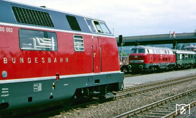 Die V200 002 steht am 03. August 1985 in Neuenmarkt-Wirsberg. Copyright: Joachim Bügel / Slg. Eisenbahnstiftung