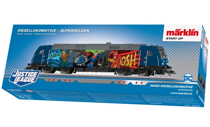 Die berühmten DC-Comic-Superhelden fahren mit dem Zug. Die moderne Diesellok ist das perfekte Zugpferd für die vieln verschiedenen Superhelden-Waggons im Märklin Programm. Ob Superman, Green Lantern, Batman, Auquaman, The Flash oder Wonder Women, sie alle bringen Action auf´s Gleis.